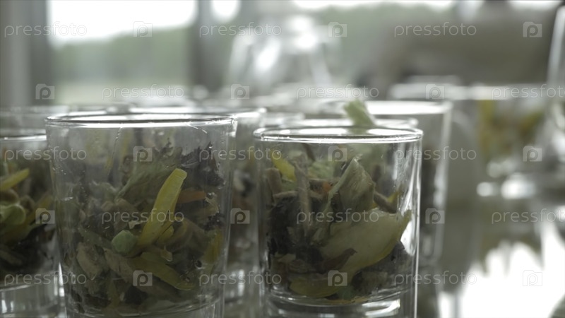 Близкий зеленый салат из томатов, салата и крекеров приправляется майонезом в стаканах. Верринские закуски, огурцы, сливочный сыр, травы, каперсы в стеклах. праздничное угощение близко