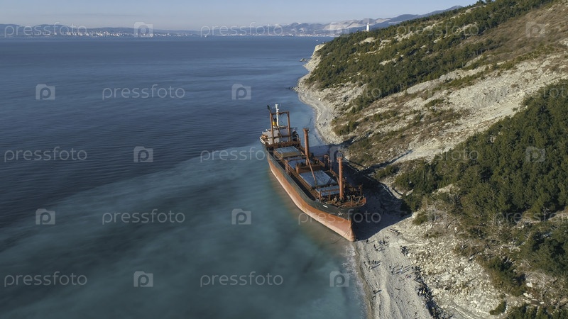 Вид с воздуха большого грузового судна в голубых водах недалеко от береговой линии