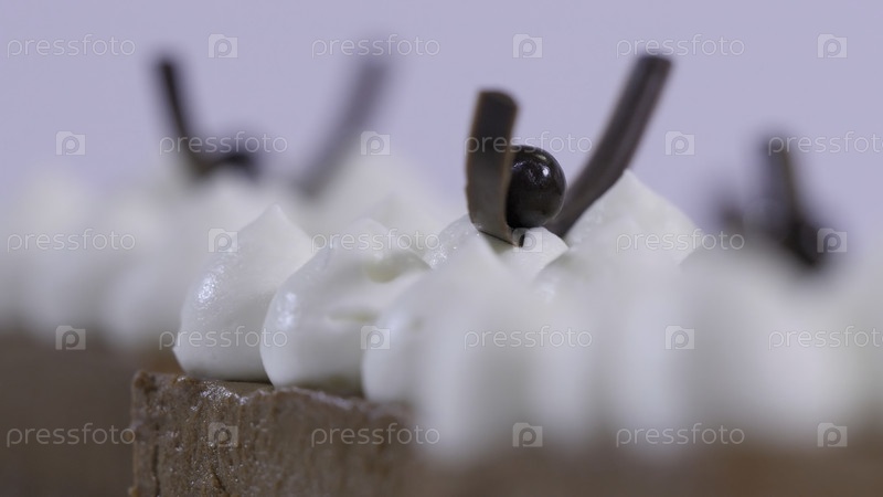 Шоколадные торты на белой тарелке с вип-кремом. пустынная шоколадная мусса с вип-кремом