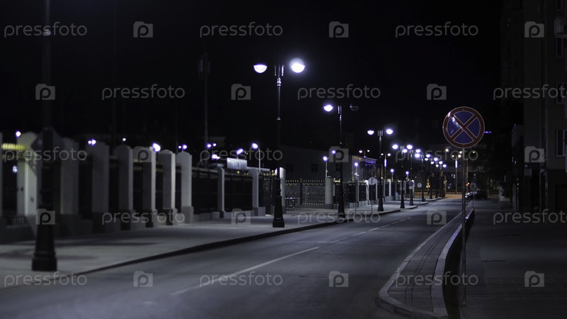 Пустая дорога, освещенная фонарями ночью. резервные кадры. летняя ночь в городе, озаритая белыми огнями, опустошает дороги позже