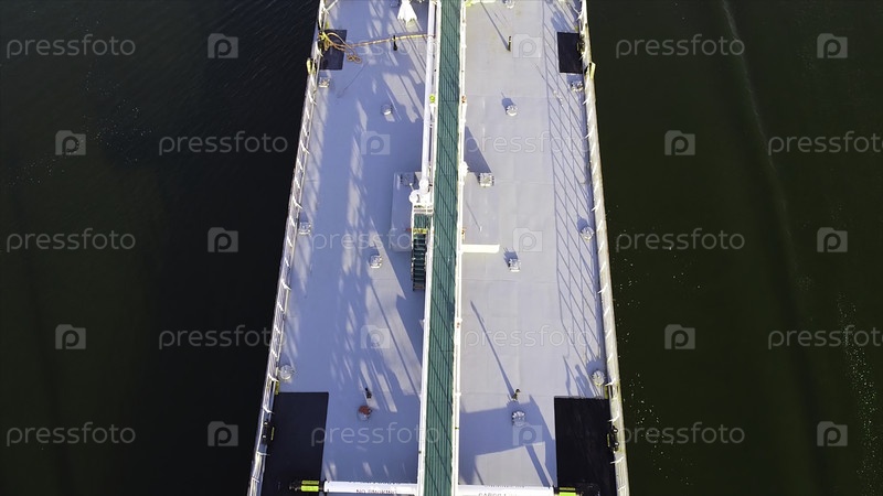 Вид сверху на палубу грузового судна, плавающего по реке. Кадры. Красивая грузовая лодка с длинной просторной палубой для больших грузов. Внутренний грузовой водный транспорт