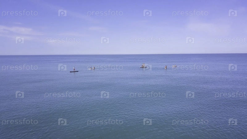 Группа людей плавает на доске SUP. Прекрасный морской пейзаж с людьми, отдыхающими на воде с досками SUP. Вид на бирюзовое море с людьми на плавательных досках