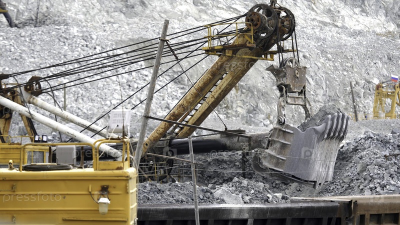 Экскаватор и железная дорога с рудой. экскаватор заполнен вагонами руды на фоне открытой ямы. тяжелый транспорт в горнодобывающей промышленности
