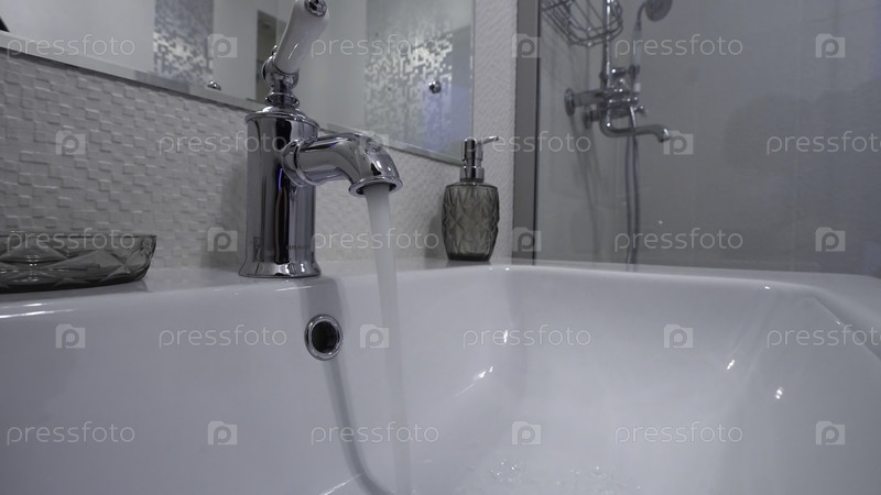 Вода течет из крана в современной ванной