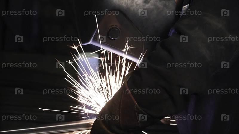 Мужчина работает с сварочной машиной. Клип. Сварка стальных конструкций на фабрике. Красивые искры вылетают