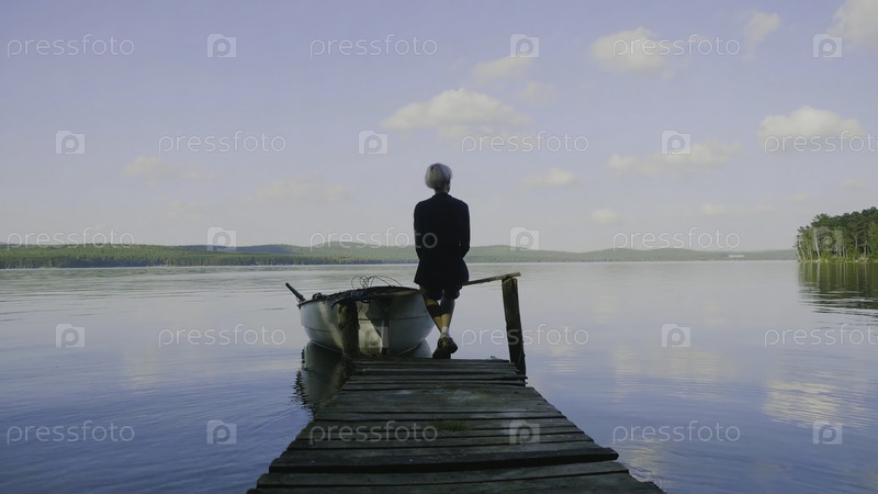 Вид женщины, сидящей на крошечном деревянном пирсе у пруда. Красивая молодая девушка сидит на речной доке в фоне. Вид сзади