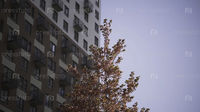 Ветви с красными листьями на фоне многоэтажных зданий. Идите дальше. Вершина дерева с осенними листами шелестят в ветре в ясный день. Дерево с красными листьями на фоне здания и голубого неба