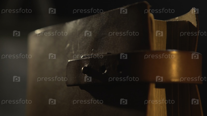 Закрытая старая кожаная книга с кожаными ремнями в темной комнате.Винтажные книги со кожным покрытием, крупный план