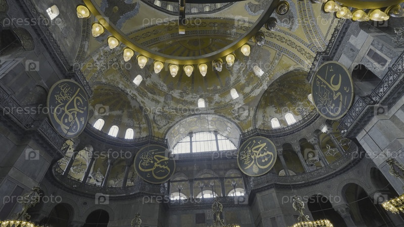 Вид на люстру и купол в храме. Идите дальше. Вид снизу на красивую купольную арку в исторической мечети Святой Софии. Архитектурные достопримечательности Стамбула