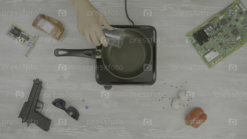 Человек наливает масло в сковородку, на столе есть: пистолет, очки, чипсы и перец, абстракция для тарелки Instagram