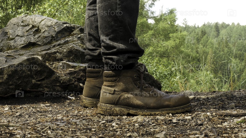 Близость путешественника в ботинках, стоящих на земле. Резервные кадры. Специальные туристические сапоги прекрасно выдерживают испытания грязи, длинных походов и восхождения по горам