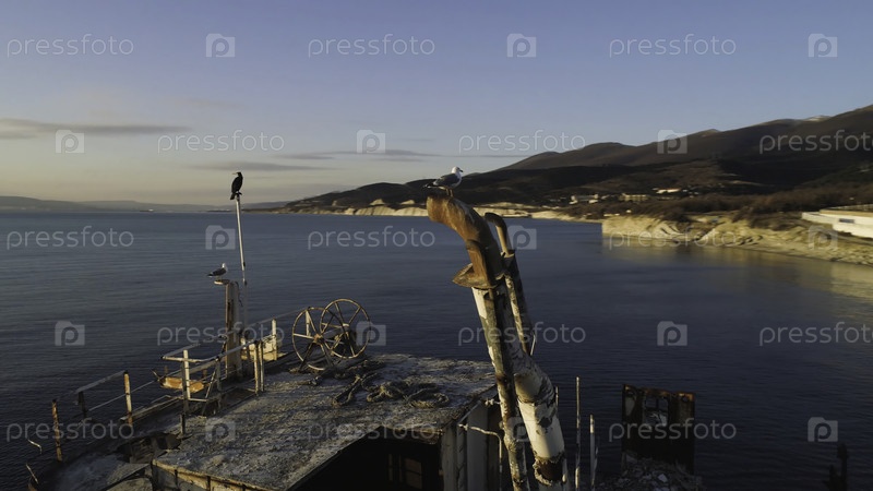 Старый катер, стоящий на пляже при закате солнца против неба.Стреляйте.Чайки сидят на кораблекрушении при закате