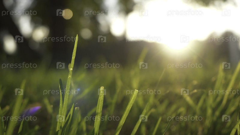Летнее движение луга травы размывает приятный ветер с ярким солнечным светом, солнечный весенний фон