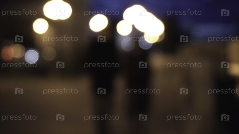 Ночная улица и силуэты людей, размытый фон. Размытость. Пара гуляет по городу ночью