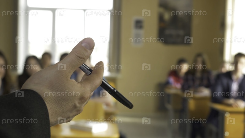 Учитель с группой старшеклассников в классе. вид из рук учителя, объясняющего лекцию