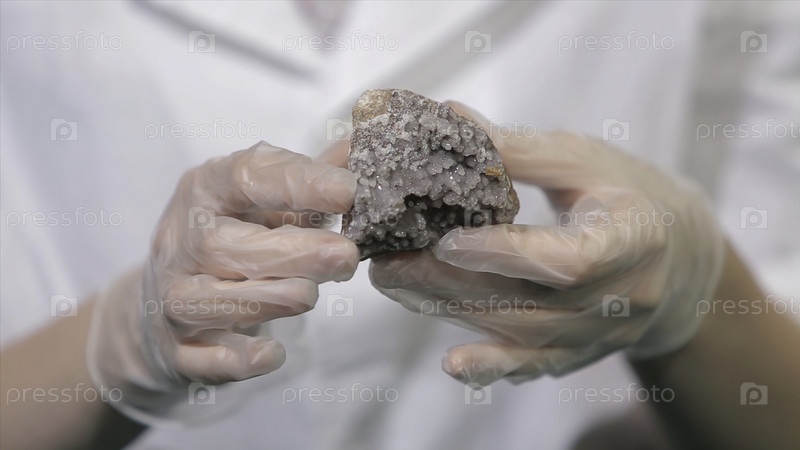 Ярко-серая рубиновая кристаллическая руда в руке с перчатками.Кристализация - это естественный или искусственный процесс, посредством которого в лаборатории образуется твердое вещество
