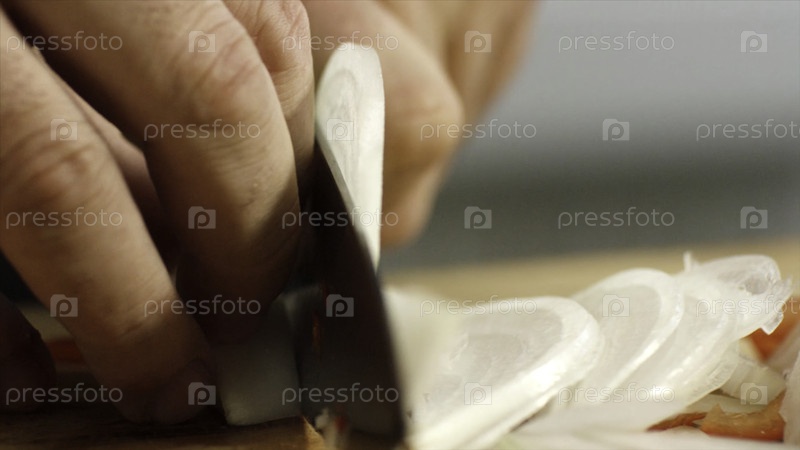 Профессиональный шеф-повар режет лук. резервные кадры. нарезание лука для блюда с острым ножом в руках профессионального повара ресторана