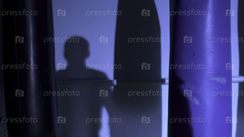 Мужчина-спортсмен стоит и занимается теневым боксом в тренажерном зале