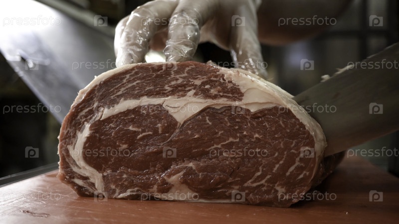 Мясник в перчатках разрезает тушу красного мяса.Продолжайте.Профессиональный нож режет огромный кусок мяса в мясной лавке