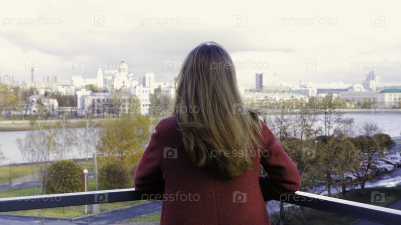 Обратный взгляд на молодую женщину, стоящую на балконе