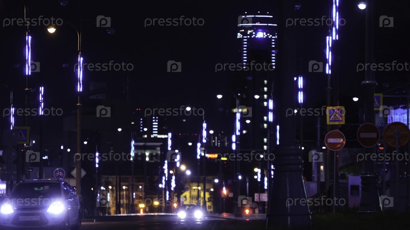 Вид на ночной город с огнями. резервные кадры. световые следы на современном строительном фоне