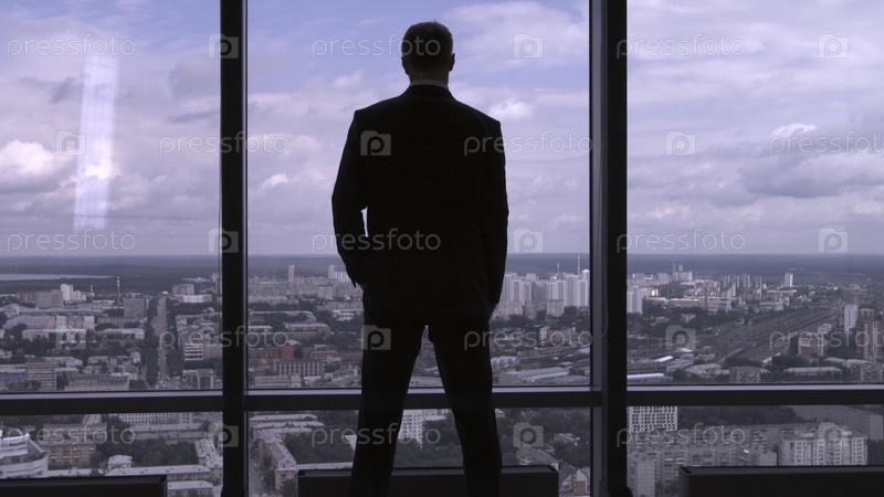 Полный обзор успешного бизнесмена в костюме, стоящего в офисе с руками на пояснице, генеральный директор