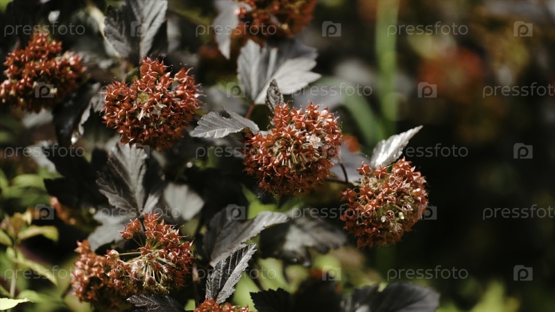 Красивая ветвь с красными цветами. Дерево с красными цветками мягко волнуется на ветре. пузырьки мочевого пузыря киноле (Physocarpus opulifolius)