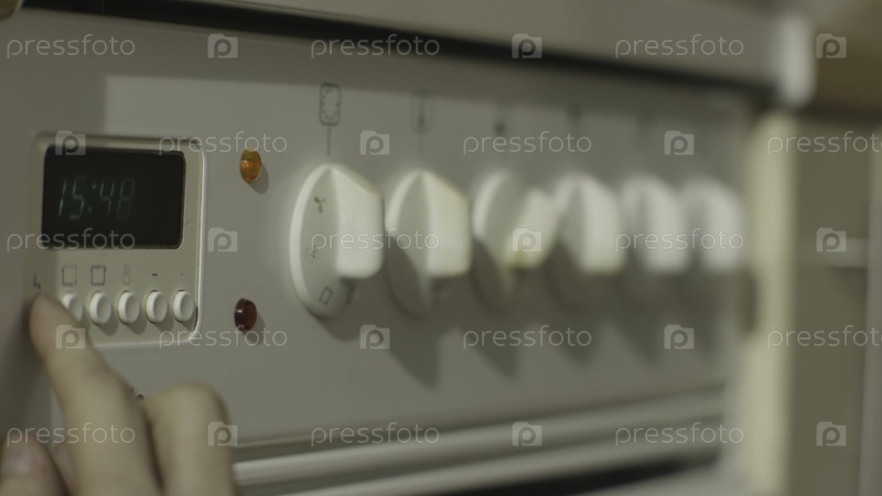 Женская рука включает в себя белую кухонную газовую плиту.Женщина включит печь на кухне