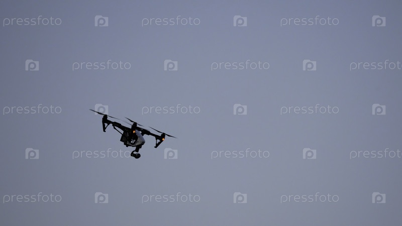 Черный дрон с камерой летит над голубым небом. черный дрон в небе. летающий квадрокоптер в небе с установленной цифровой камерой для производства видео и фотографий