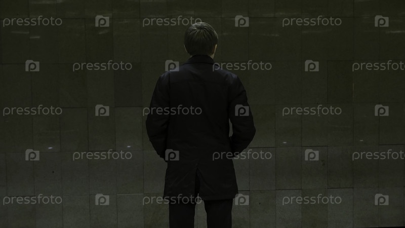Одинокий молодой человек на заднем сидении станции метро.Молодой человек, ожидающий поезд в метро, вид сзади