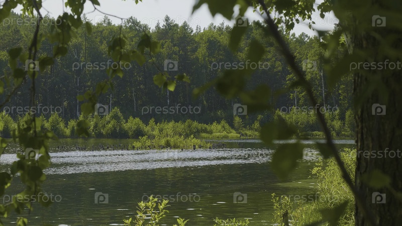 Красивые прозрачные голубые воды на берегу озера.Лесной пейзаж на побережье отражается в воде