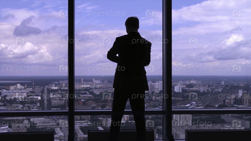 Бизнесмен в костюме стоит рядом с большим окном офисного здания и смотрит на часы