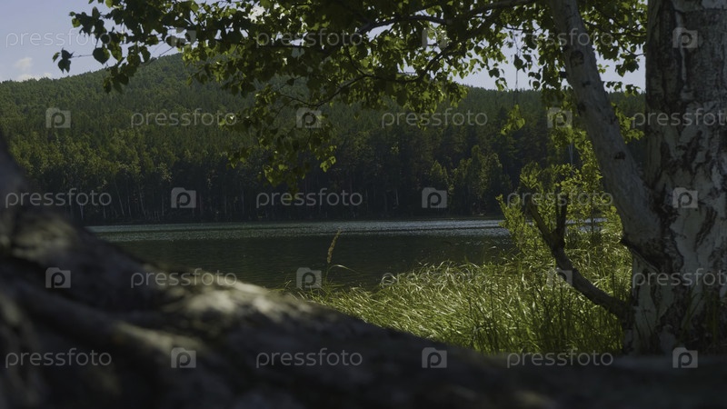 Красивые прозрачные голубые воды на берегу озера.Лесной пейзаж на побережье отражается в воде