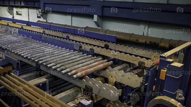 Производство рельсов для поездов и грузовых вагонов, вагонов. Железнодорожный завод. Стальной круглый стержень - это материал железных металлических железнодорожных линий для промышленного строительства на складе. Большая пресса. Анимация HD