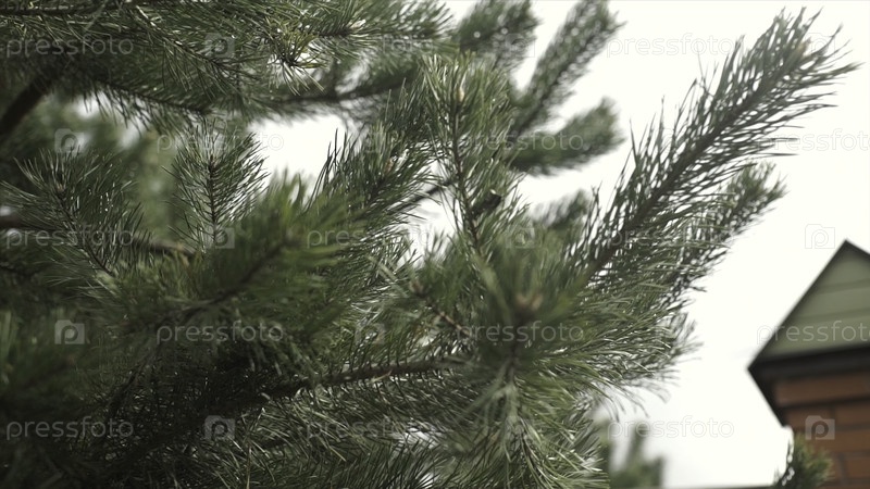 Фурнистые ветви. Вечнозеленая еловая ветвь. Голубые и зеленые спермовые иглы на ветках. Зеленые колючие ветки дерева-фура или сосны