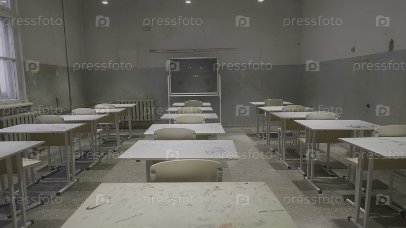 Пустой класс с деревянными столами, бело-зелеными досками в школе. пустый класс. заброшенный школьный класс со школьными партами и доской