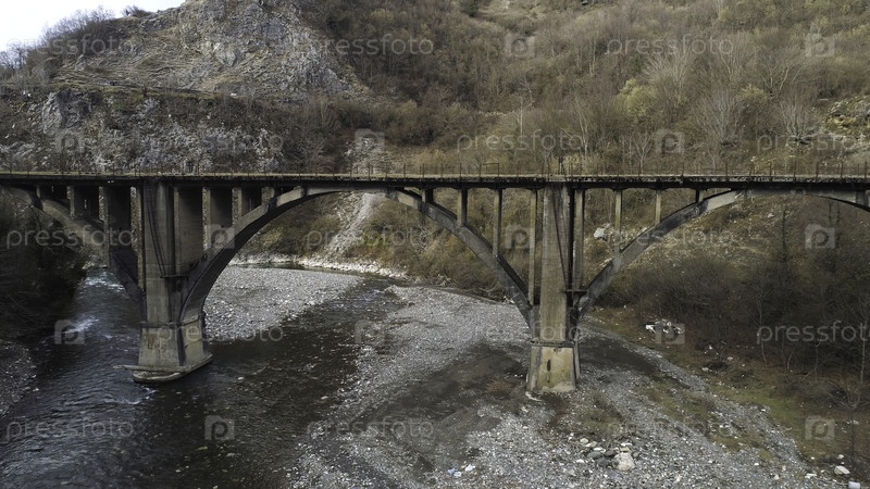 Воздух небольшой деревушки, расположенной в долине рядом с высокими лесистыми горами. летая над старым бетонным мостом, покрытым зеленым мхом и сужающейся холодной рекой