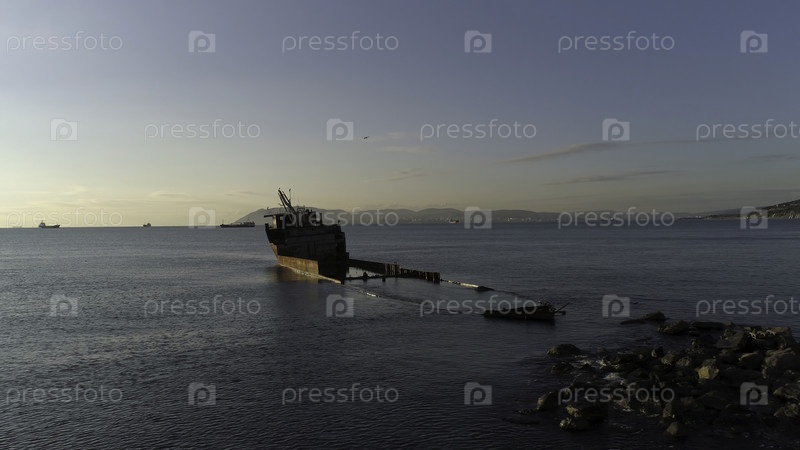 Расти разбил корабль, который затонул в голубом море на синем облачном небе и сияющем солнечном фоне
