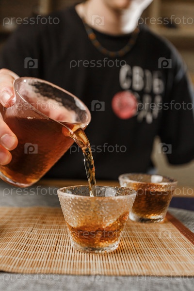 Вливание темного напитка в традиционные стеклянные чашки для приятного напитка