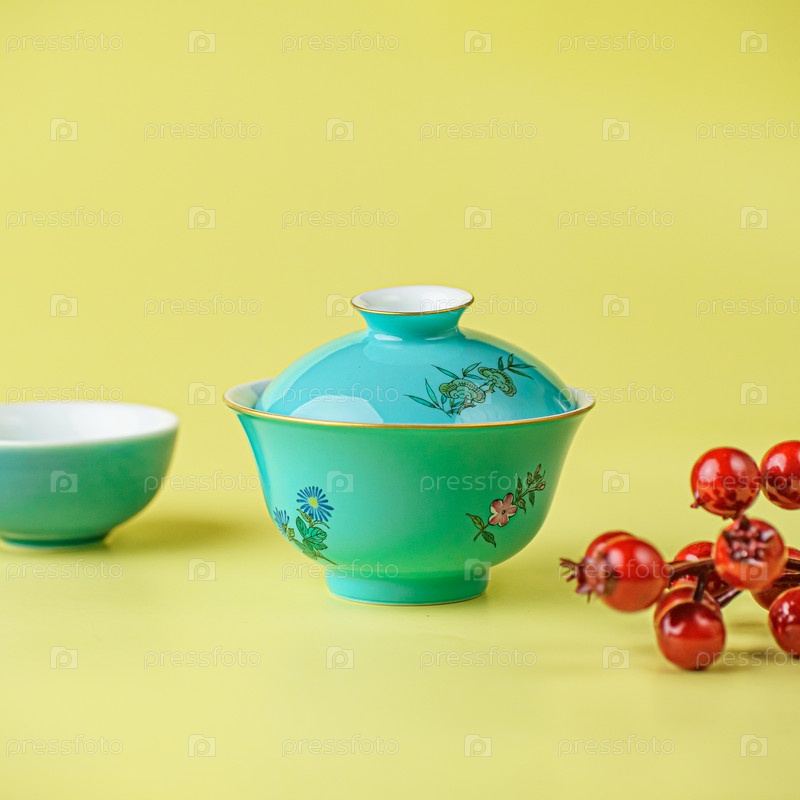 Ремесленные фарфоровые чайники на ярко-желтом фоне, с сложными цветочными узорами и живыми цветами