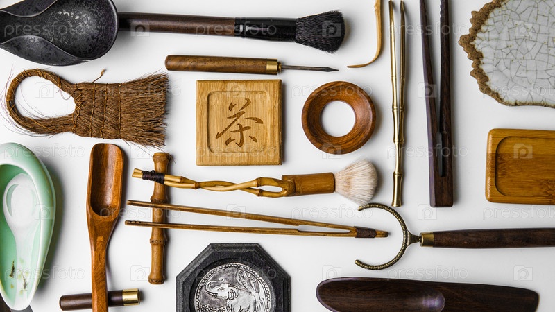 Тщательно организованная коллекция инструментов чайной церемонии, которая демонстрирует элегантность и исключительное мастерство
