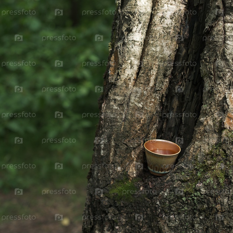 Рустичная керамическая чашка удобно расположена в коре дерева, создавая красиво спокойную природную сцену