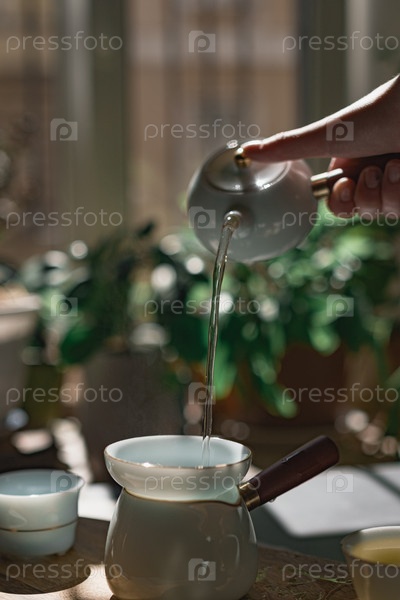 Спокойный и спокойный момент, красиво захватывающий прекрасное искусство наливания чая в окружении пышной зелени