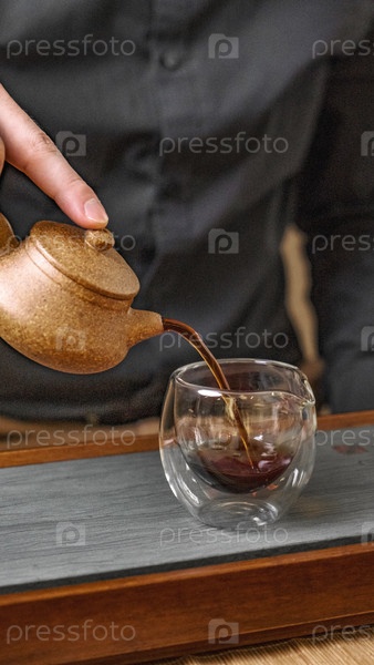 Умелая рука любезно наливает ароматный чай из элегантного традиционного чайника в прозрачную стеклянную чашку