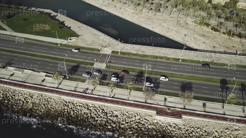 Самолет стрелял вслед за автомобилями на автомагистралях вдоль скалистого побережья.Сток.Вид с воздуха береговой линии и шоссе