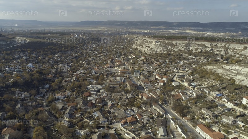 Город окружен скалистыми холмами.Авиационный вид красивого городского пейзажа вблизи гор