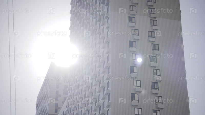 Многоэтажное здание на фоне солнца и чистого неба. Идите вперед. Нижний вид красивого жилого дома на фоне яркого солнца и неба
