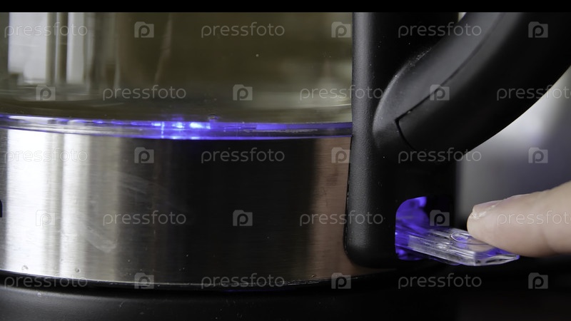 Нажмите на кнопку чайника. СМИ. Близкий план человека, включающего электрический чайник с освещением. Красивый прозрачный чайник со светом. Включение электрического чайника для кипения воды