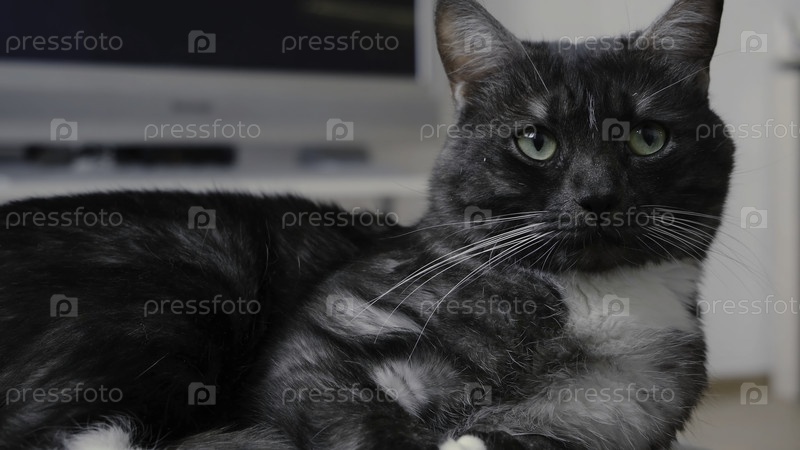 Вид на уровень чёрно-белой домашней кошки. Концепция. Красивая пятнистая черно-белая домашняя кошка лежит на фоне домашнего комфорта