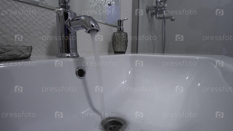 Вода течет из крана в современной ванной